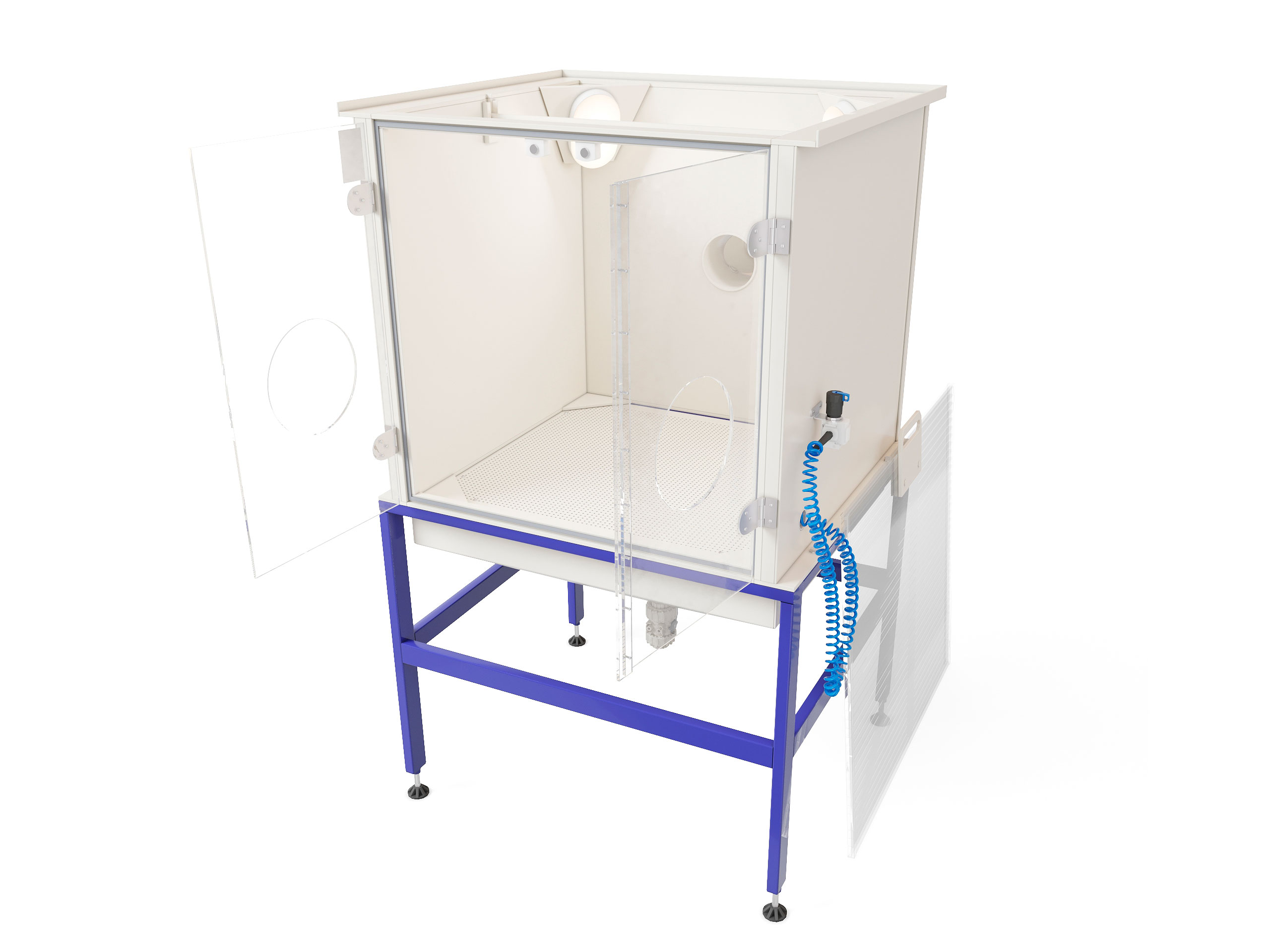 Обдувочная камера предназначена для удаления влаги с поверхностей деталей при помощи обдувочного пистолета. Данное устройство позволяет осушать детали сложной формы с потайными карманами и прочими фасонными элементами, в которых, после проведения промывочных операций, может оставаться влага. Камера не отличается высокой производительностью по количеству осушаемых деталей за единицу времени, так как основным требованием, при включении такой конструкции в линию, является качественное осушение деталей сложной формы.