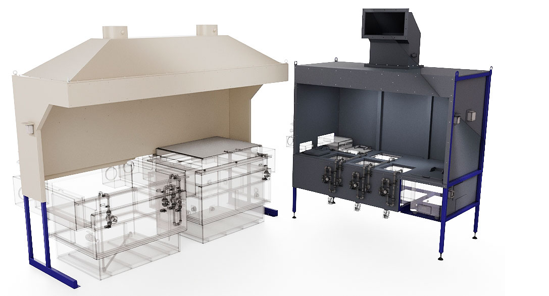 Некоторые технологические процессы на ручных гальванических линиях осуществляются в шкафных укрытиях. Благодаря применению шкафных укрытий, зачастую в комбинации с бортовыми отсосами, достигается максимальная эффективность при удалении вредных веществ, выделяемых при технологическом процессе.